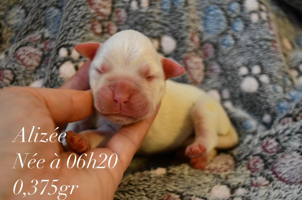 Femelle blanche Née à 06h20 Poids 0.375gr Collier orange Achka est parti vivre dans le Loir et Cher