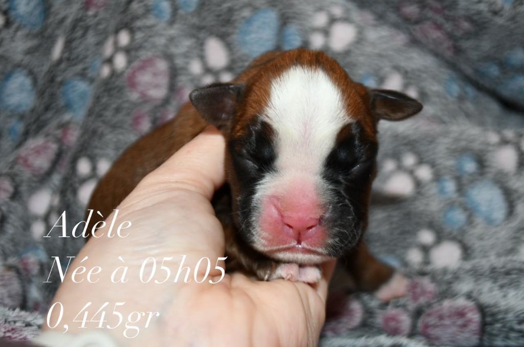 Femelle marquée en blanc Née à 05h05 Poids 0.445gr Pas de tâche blanche sur la nuque Adèle est parti vivre dans les Landes