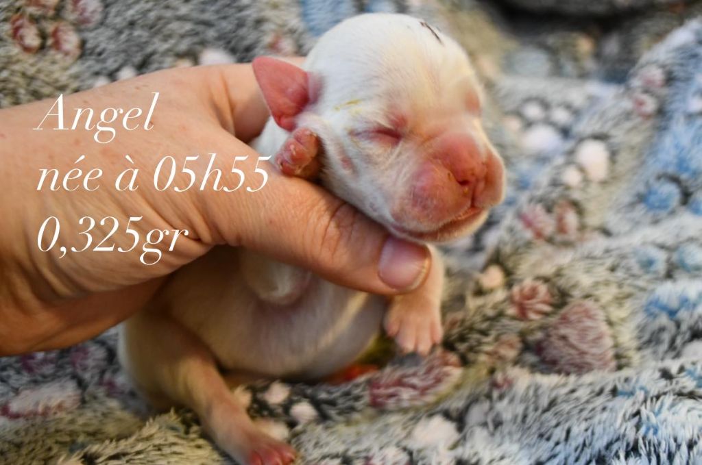 Femelle blanche Née à 05h55 Poids 0.325gr Collier violet Angel dite Aria est parti vivre dans l'Aude
